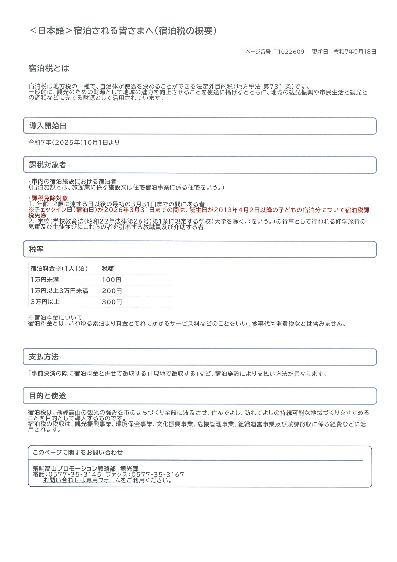 高山市では令和7年10月1日から高山市の宿泊全施設におきまして宿泊税導入が決定されております。